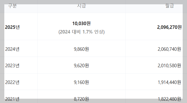 2025년 최저임금은 시간당 10,030원으로 결정되었으며, 전년도(2024년, 9,860원) 대비 170원 오른 1.7% 인상률을 기록했습니다. 월 환산액(주 40시간 기준, 월 209시간 적용)은 약 2,096,270원이며, 약 383만 명의 근로자가 최저임금의 직접적 영향을 받는 것으로 추정됩니다.